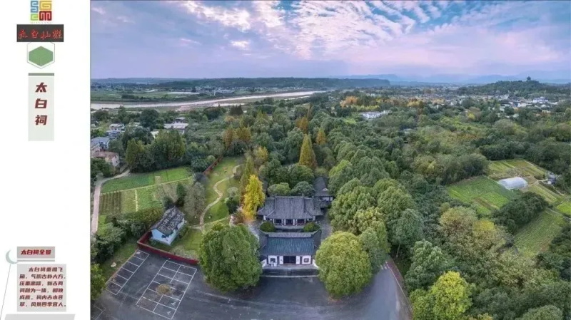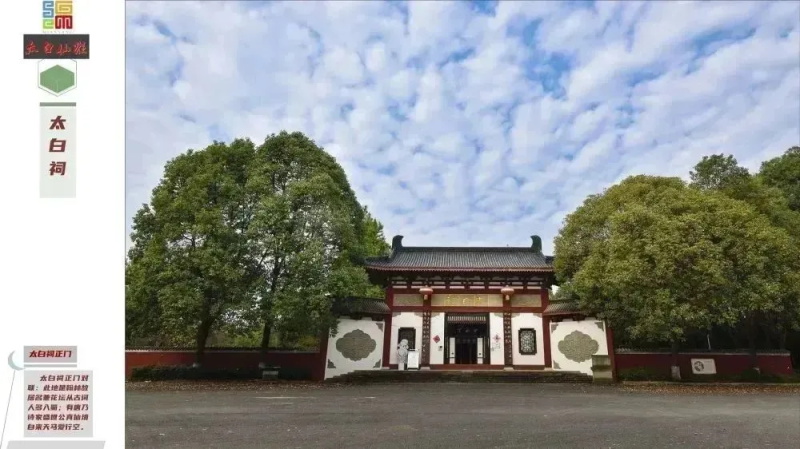 太白祠位于青莲镇陇西院以南的盘江和涪江交汇处,是李白故里历代祭祀李白的建筑,据《彰明县志》载,太白祠初建于宋代,屡遭兵火又多次整修。现存的大门、过厅、厢房、正堂及庭院格局,形成于清乾隆年间。1962年,太白词被四川省人民政府公布为省级文物原护单位,邓小平同志题辞“李白故里”石碑立于新修大门庭院处。